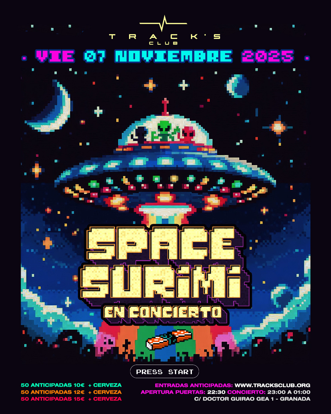 ¡Pulsa START y únete a la invasión musical! 🛸#SpaceSurimi #TracksClub #ConciertoGranada #HipHop #MúsicaEnDirecto
